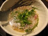 冷たい味噌だしにアジのお刺身とたっぷりの薬味が入っています。