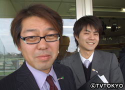お2人とも着飾っています。どこを見ても超有名騎手から馬主・調教師など見たことアル人ばかり!圧倒されました。それでも大竹嬢はインタビューをするため、果敢に突進しておりました。かわいい顔をしていますが、根性あります!