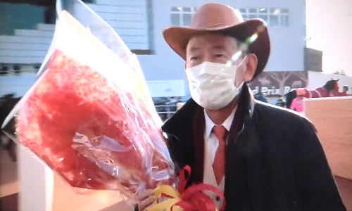 レース終了後、愛弟子の下へと向かう大久保調教師。
