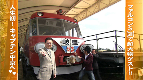 中京競馬場名物!名鉄電車の前からキャプテンさん、吉沢さんが予想を発表します。