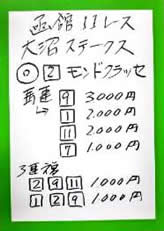 【結果】 1着(2)モンドクラッセ・1番人気 2着(12)ビービーバーレル・3番人気 3着(4)ナリタスーパーワン・7番人気 |