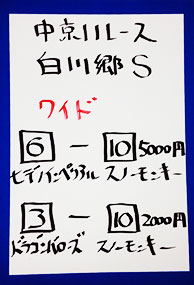 | 【結果】 1着(5)コスモナインボール・5番人気 2着(4)テスタメント・8番人気 3着(8)ミッキースワロー・1番人気 |