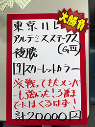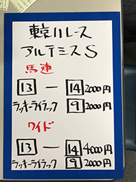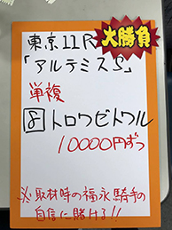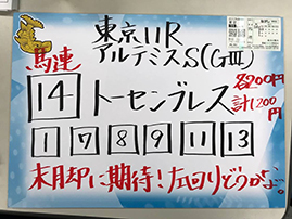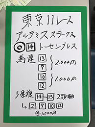 それでは、もう一方の重賞!GⅢ「アルテミスステークス」で馬券対決です。結果はこちら。
