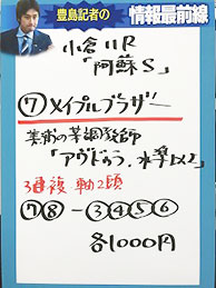 | 【結果】 1着(5)タガノディグオ・2番人気 2着(7)テルペリオン・1番人気 3着(9)メイプルブラザー・3番人気 |