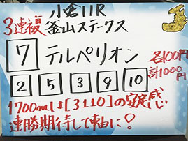 それでは馬券対決に戻りましょう!小倉メイン「釜山ステークス」の結果です。