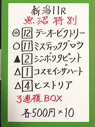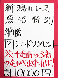 続いては、新潟メイン「魚沼特別」で馬券対決です。