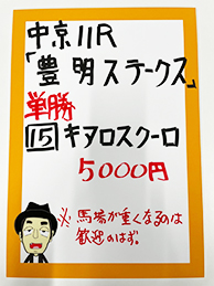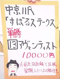 | 【結果】 1着(14)レトロフィット・5番人気 2着(10)カリーニョミノル・3番人気 3着(5)ペイシャキュウ・2番人気 |