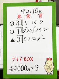 | 【結果】 1着(10)ゴーゴーユタカ・1番人気 2着(1)グランドライン・3番人気 3着(3)ミトロジー・5番人気 |