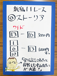 | 【結果】 1着(13)ストーリア・4番人気 2着(16)アドマイヤハダル・1番人気 3着(7)シュヴァリエローズ・8番人気 |