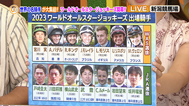 地方から高知の宮川実騎手、JRAからは去年の優勝者武豊騎手やルメール騎手や川田騎手などの