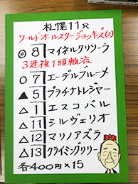 | 【結果】 1着(14)ナムラクレア・1番人気 2着(8)シナモンスティック・8番人気 3着(12)トウシンマカオ・2番人気 |