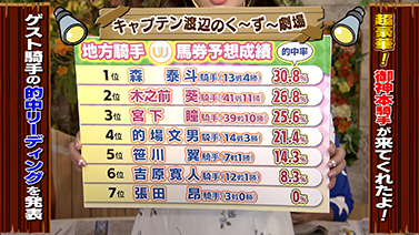く~ず~劇場ではこれまで出演頂いた地方騎手の馬券予想的中率を紹介。