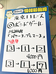 | 【結果】 1着(2)ゴンバデカブース・3番人気 2着(3)ボンドガール・1番人気 3着(1)シュトラウス・2番人気 |