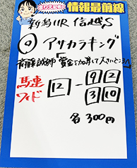 | 【結果】 1着(1)ハギノアレグリアス・5番人気 2着(2)オメガギネス・1番人気 3着(6)フタイテンロック・13番人気 |