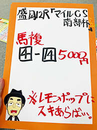 | 【結果】 1着(1)レモンポップ・1番人気 2着(14)ペプチドナイル・2番人気 3着(11)キタノヴィジョン・10番人気 |