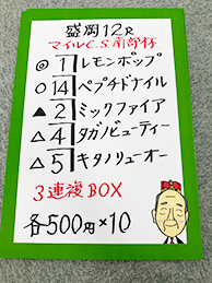 | 【結果】 1着(7)ソンシ・1番人気 2着(3)マンドローネ・3番人気 3着(6)ヤマニンデンファレ・14番人気 |