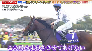 天皇賞・秋で4年連続のGⅠ制覇を達成したドウデュースに騎乗する武豊騎手です。