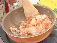 そこにみじん切りの玉ねぎを加えて、しんなりするまで炒める。