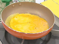 パスタが柔らかくなったら、卵と粉チーズを溶き混ぜたものをまわし入れる。 |