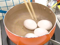 1. ゆで卵を作る(水から火にかけ沸騰後10分)※ 塩と酢を入れる