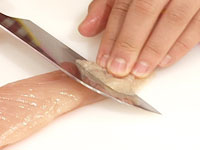1.とりむね肉を8切のそぎ切りにし、片面に塩・こしょうし、薄力粉をまぶす。 |