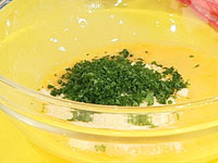 2.ボールに卵をとき、粉チーズ、パセリを入れ混ぜる。