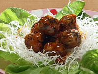 4.しょうゆドレッシング、ケチャップ、砂糖、水溶き片栗粉を混ぜ合わせ、 フライパンに入れ火にかける。とろみがついたら(2)を入れ、からませる。 サラダ菜と(3)を置いた皿に(4)をのせる。 |