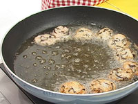 フライパンに油を1cmくらい入れ、火にかけ、網で肉団子を入れる。
