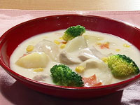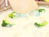 4.牛乳、生クリーム、コーン、ゆでたブロッコリーを入れる。盛り付ける。 |