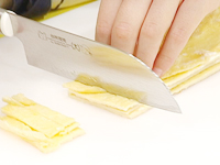 5mm幅の小口切りにする。 ボールに卵をほぐし、ほぐした鮭と牛乳を入れ、