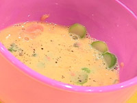 3.フライパンにバターを熱し、(2)を流し入れ、半熟になるまで箸でかきまぜる。 |