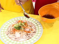 4.皿に(2)を敷き、水気をきった野菜を盛り、ドレッシングを半分かける。 |