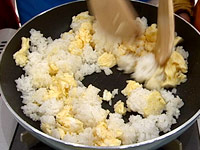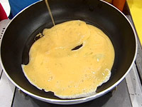 1.熱したフライパンに油をひき、溶き卵を流しいれる。