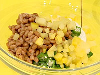 2.ボールに納豆・卵・(1)と塩・こしょうを入れ、よく混ぜ合わせる。 |