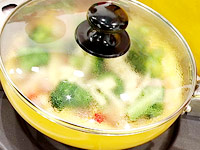 しんなりしたらブロッコリーを入れ炒め、水/コンソメキューブを入れ、