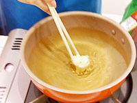3.(1)水気をペーパーでふき、(2)の衣をつけ、中温に油でころがしながら揚げる。