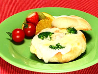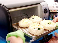 4.トースター(180℃)で5分焼く。チーズがとけたら出来上がり。プチトマトを添える。 |