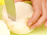 パンは上から1/3をスライスし、ふちを1cmずつくらい残して中身をくり抜く。