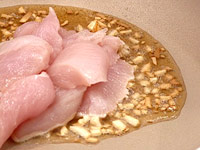フライパンにごま油を入れ、ニンニクを入れて香りが出るまで炒め、鶏肉を加えて