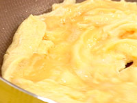 溶いた卵を流し入れ、大きくかきませながら半熟卵を作る。