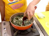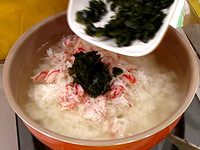 カニの身、わかめを加えて煮る。 |
