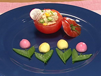 3.皿に(2)をリング型に盛り、中に新じゃがを盛り付け、(1)のアンをかける。