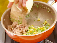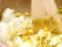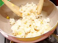 フライパンにバターを熱し、ごはん、コーン缶を入れて炒め、しょうゆと塩で味をととのえる。 |