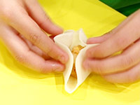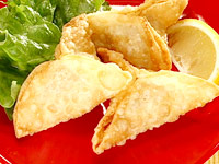 4.ギョーザの皮に包む。180℃の油で3〜4分キツネ色になるまで揚げる。 |