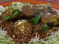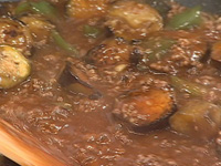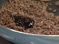 3.油でみじん切りしたにんにく、生姜を炒め、合いびき肉を加えてさらに炒め、 テンメンジャン、鶏がらスープ、醤油、ケチャップ、酒を加え、ひと煮立ちさせる。