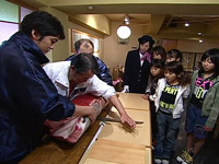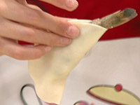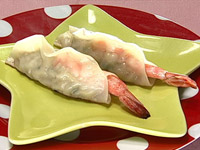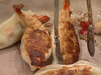 2.餃子の皮に@とブラックタイガー(尾を残して殻をむき、 塩こしょうで下味つけたもの)を入れる ブラックタイガーは尾を餃子の皮からはみだすように包む。