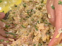 1.キャベツ(茹でてみじんぎりにし、水気を切ったもの)にら(みじんぎり) 長ねぎ(みじんぎり)生姜(みじんぎり)豚ひき肉と調味料(醤油、酒、砂糖、片栗粉、 ごま油、塩)を加え混ぜ合わせる