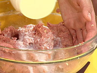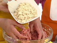 1.挽き肉とおから、玉ねぎ(みじん切りし、バターで炒め、塩こしょうで味つけしたもの)、卵、塩こしょうを混ぜ合わせる。