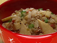 4.炊いたごはんに炒めた具材(3)を加えて混ぜ、インゲン(茹でて小口切り)と桜海老を混ぜ、器に盛り付ける。 |