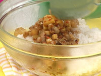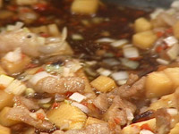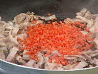 1.生姜(みじん切り)を炒め、豚バラスライス(細切り)と人参(粗みじん)、干ししいたけ(粗みじん)を炒める。 |